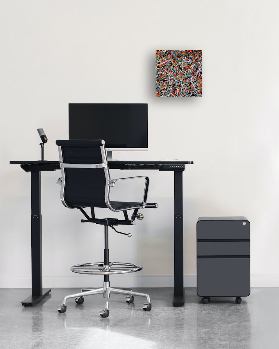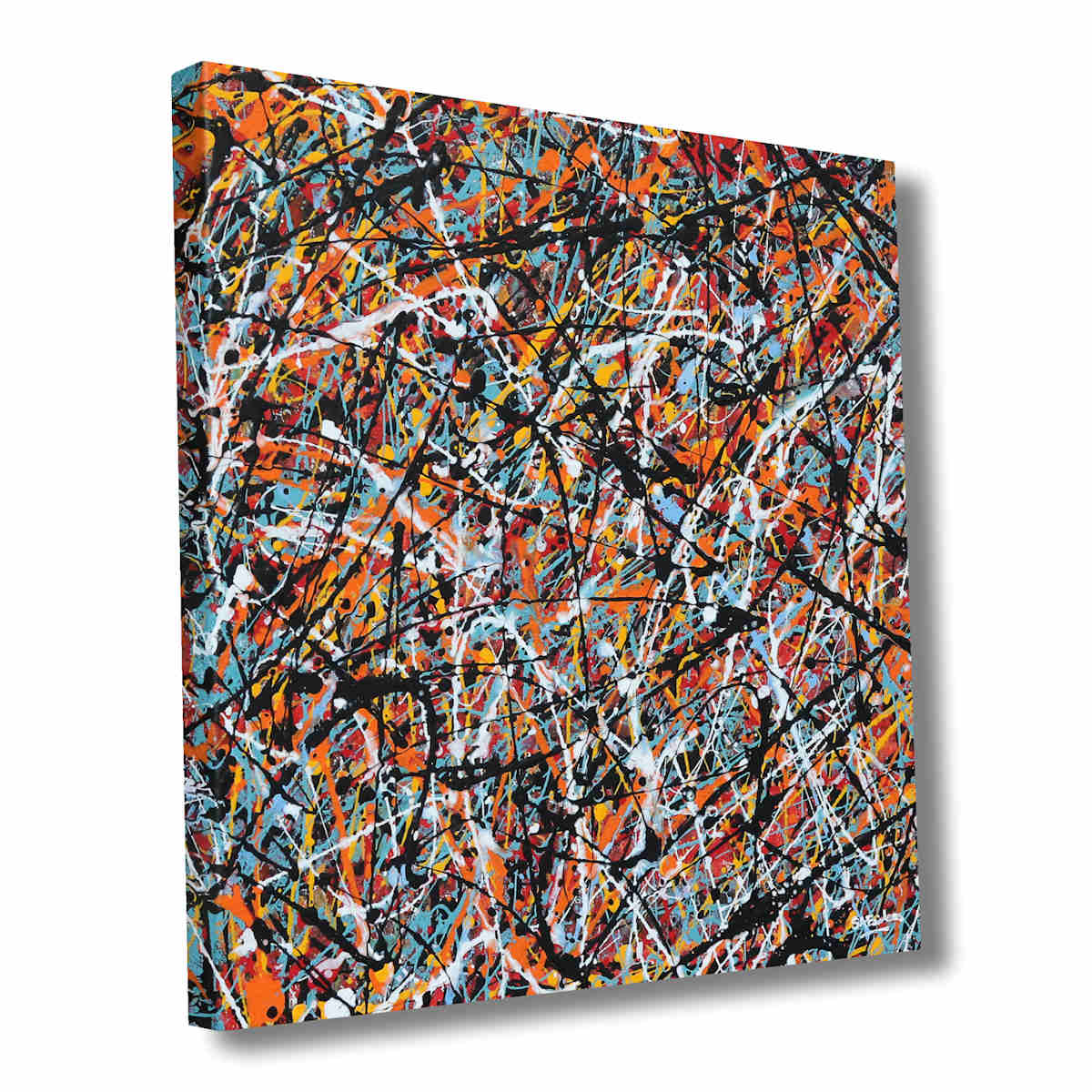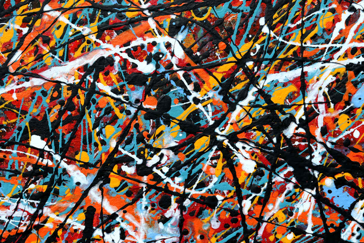 A bright optimistic work in Jackson Pollock action art style. Full of expression this work reminds me of balance within chaos. Nature might look chaotic for example but there is a hidden rhythm where everything fits together perfectly. As I paint these the process looks fairly chaotic but there is a definate rhythm which creates a balance to each painting as I apply the different colours.